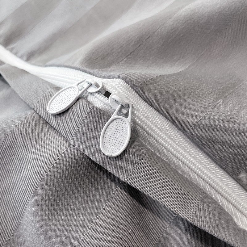 Transform your bedroom into a Scandinavian-inspired retreat with the Nordic Luxe Hotel Striped Duvet Cover Set. Featuring a timeless two-tone stripe design in elegant shades of white, light grey, and grey, this bedding set brings a sense of understated luxury and relaxation to your space.