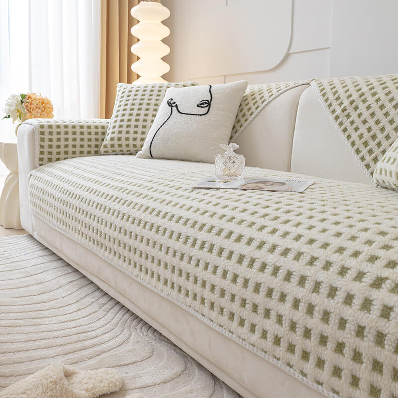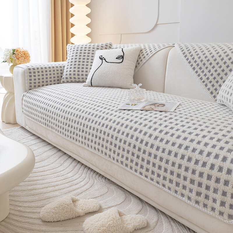 Warm Sherpa Fleece Plaid Couch Cover Furniture Protector